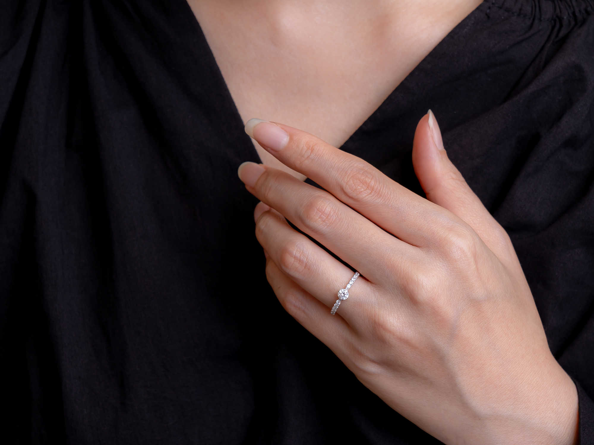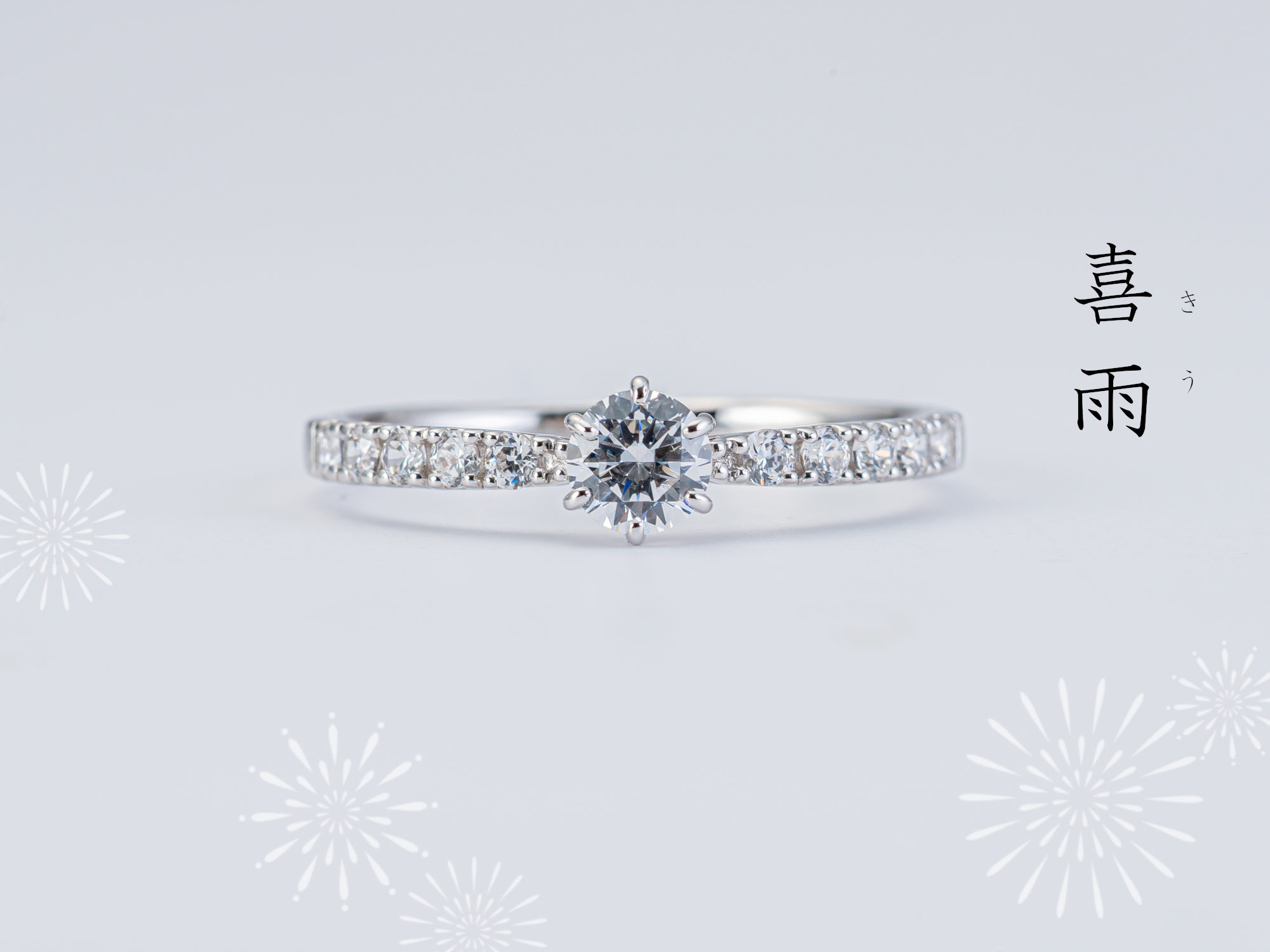 アームに連なるダイヤモンドが、雨粒のようにきらめき、中央の輝きをより一層引き立てます。まっすぐなラインが指をすっきり美しく見せ、穏やかな幸福感を感じさせる婚約指輪です。