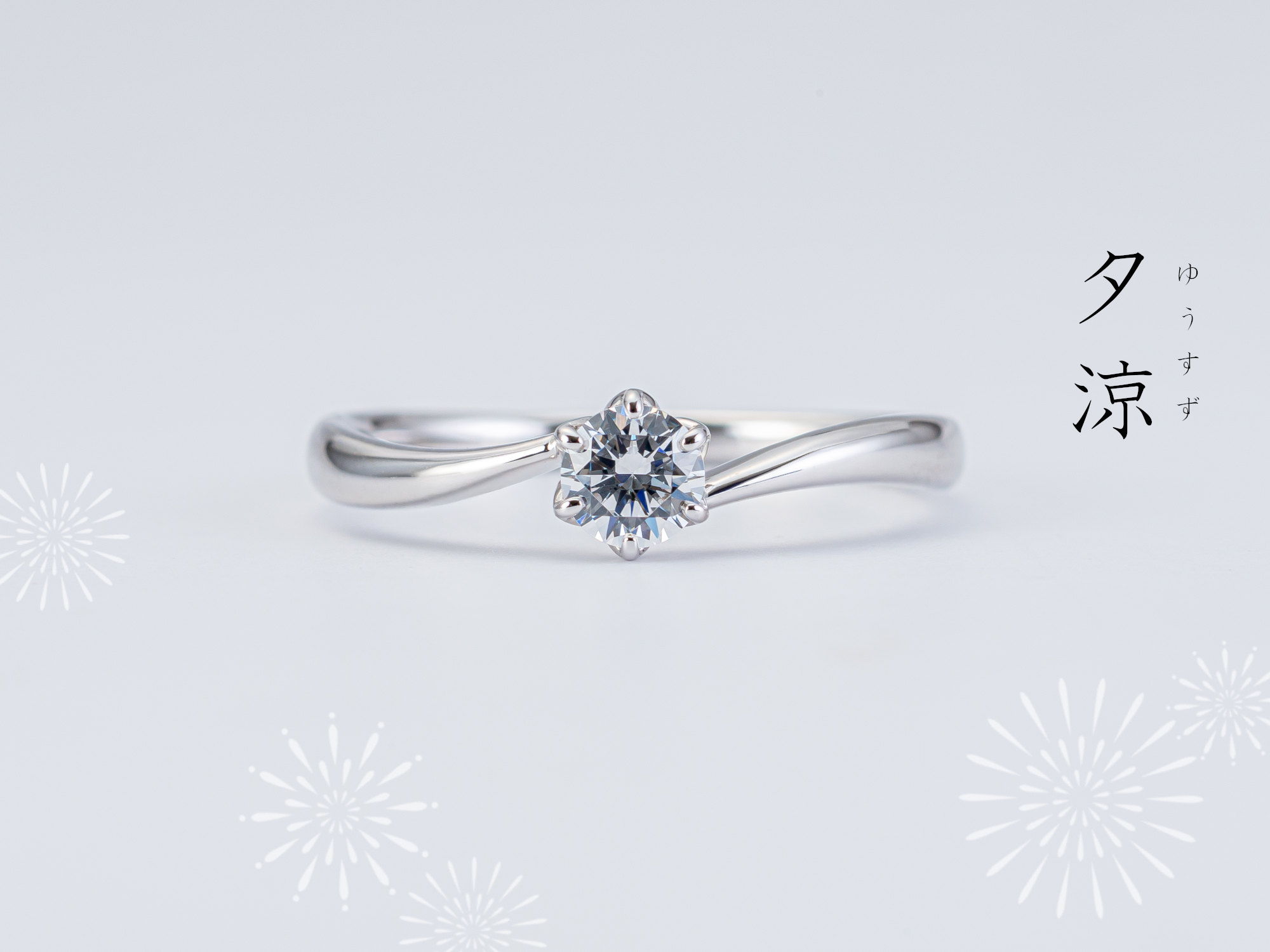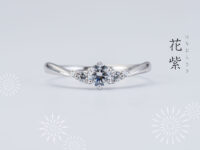 流れるようなラインが指にやさしく沿い、すっきりと美しい手元を演出します。涼感のある輝きと落ち着いた佇まいを備えた、夏の情景を映す婚約指輪です。