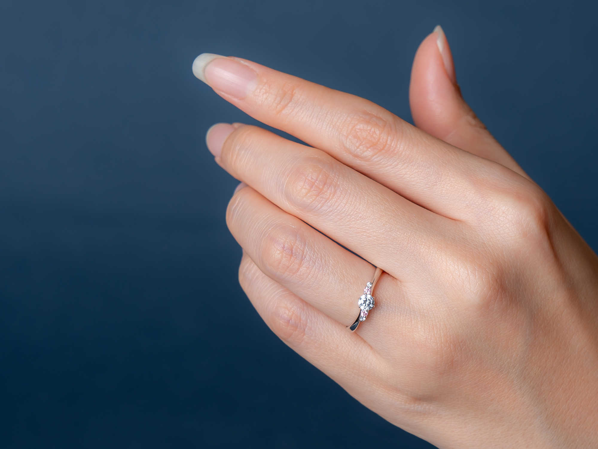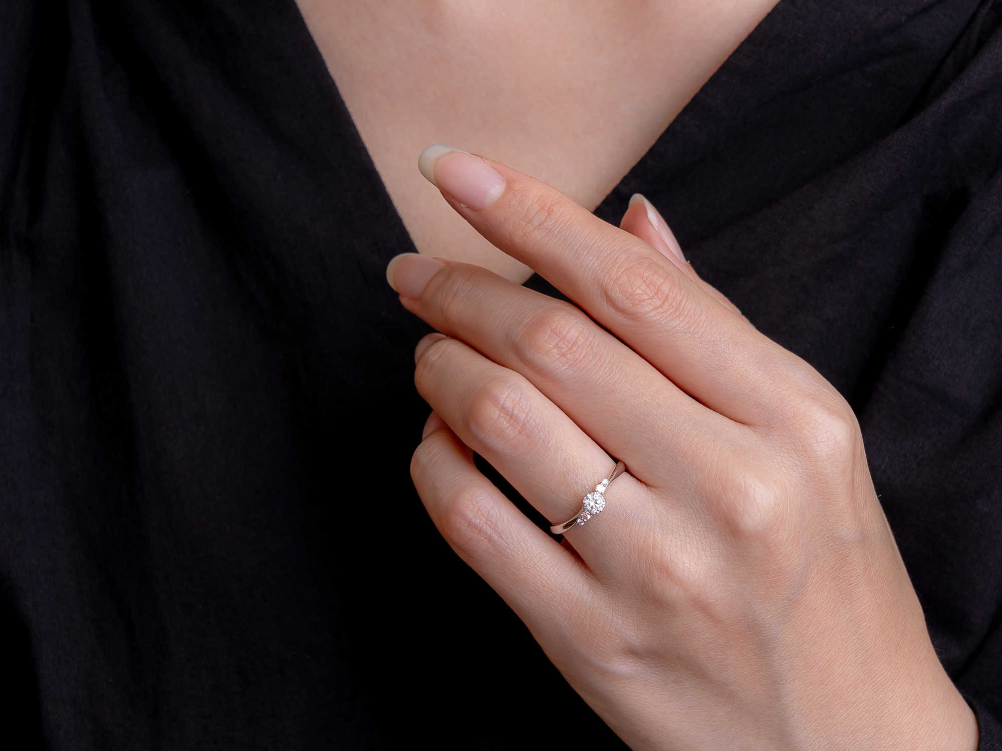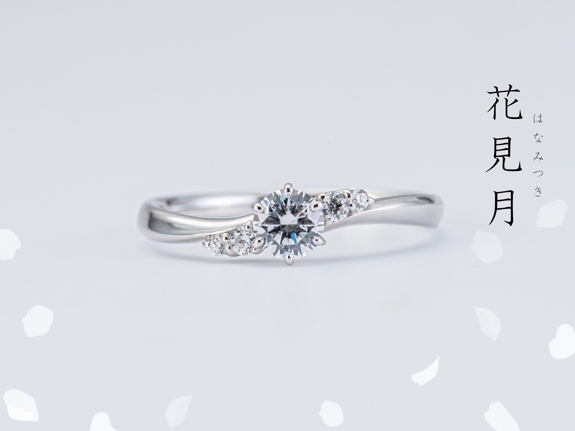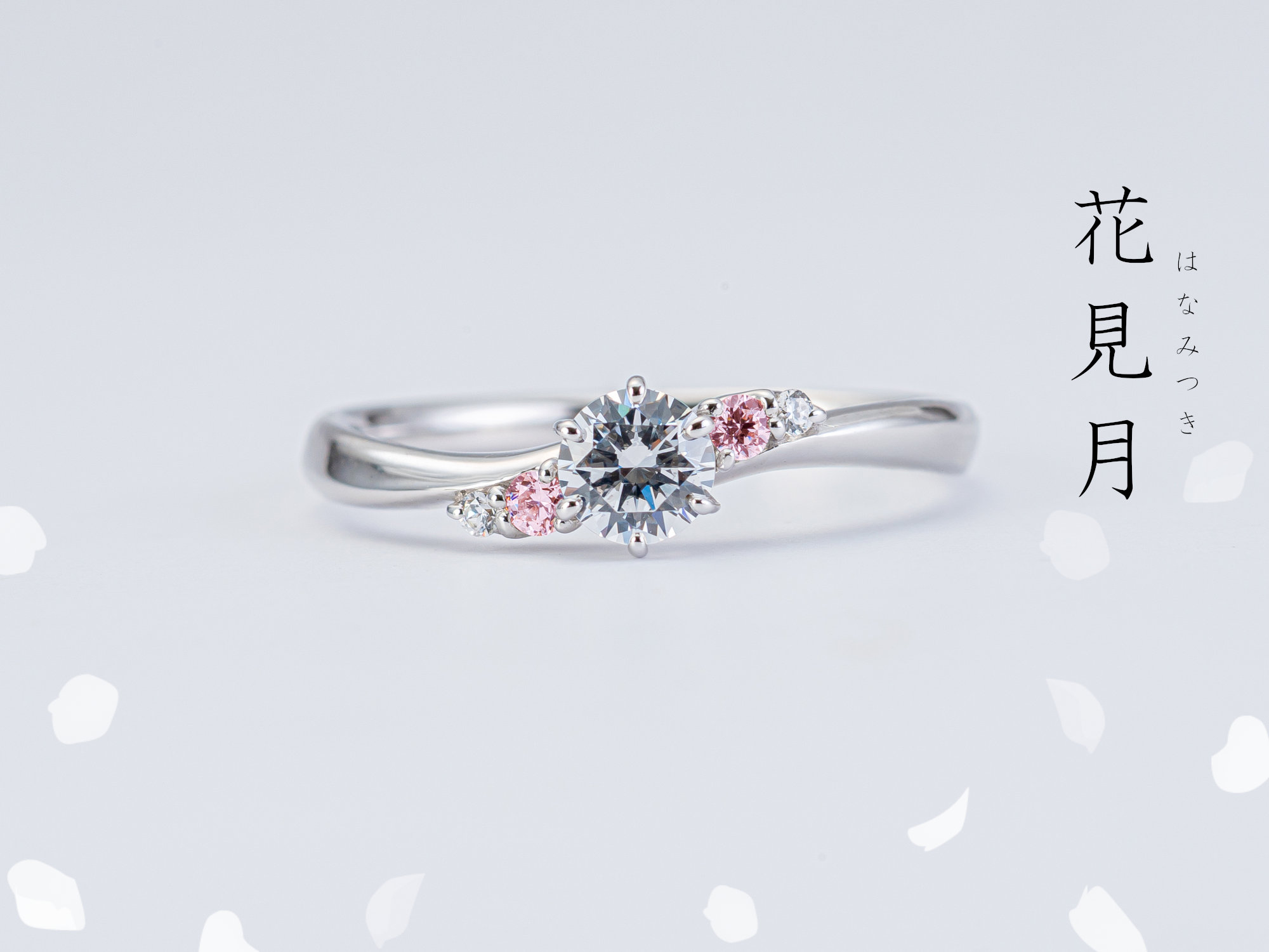 中央のダイヤに寄り添う桜色の天然ピンクメレダイヤが、春のやわらかな彩りを添えます。流れるような曲線が指になじみ、同名の結婚指輪と重ねることで、より一体感のある美しさを楽しめる婚約指輪です。
