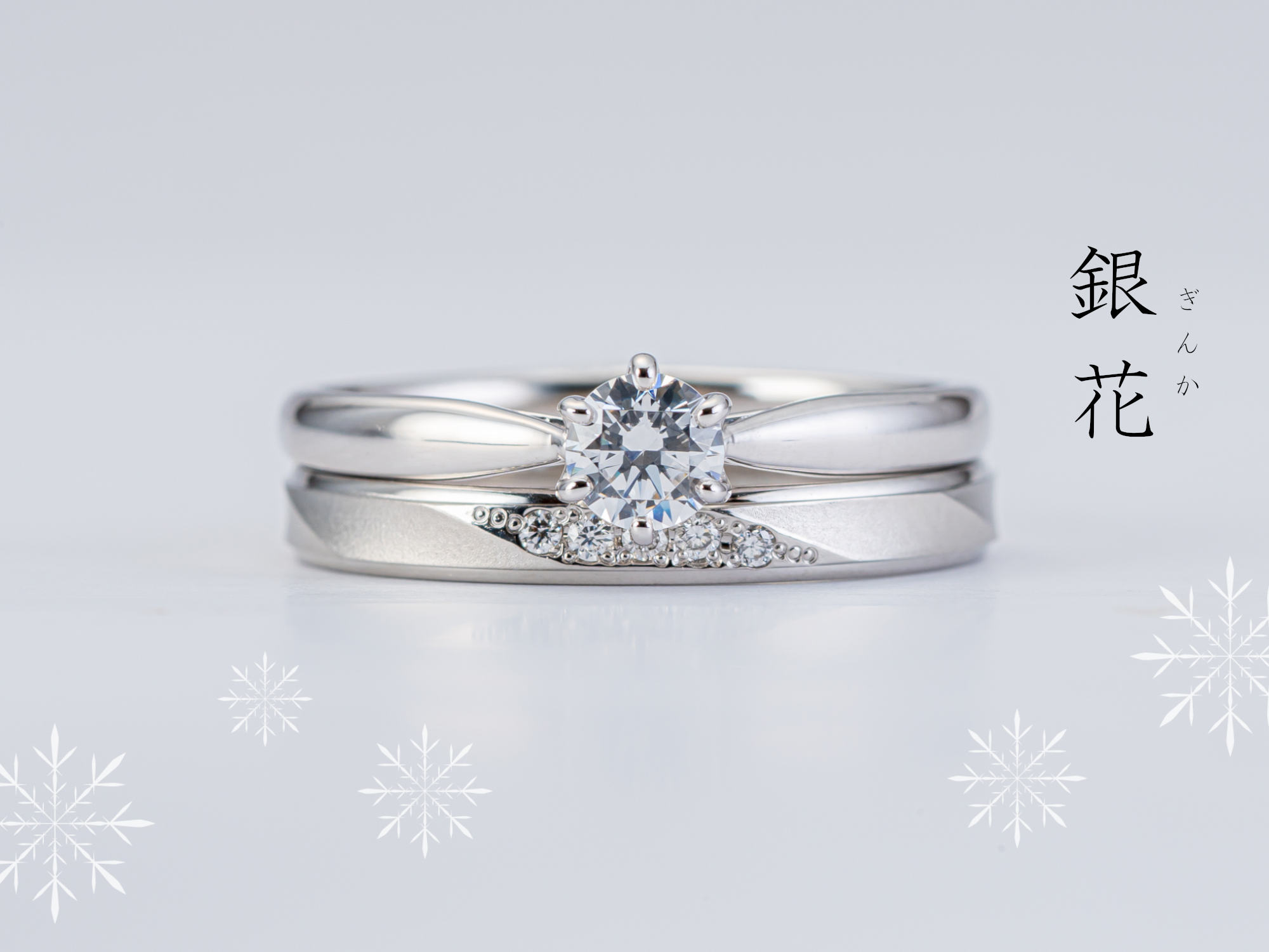 ふたりで過ごす季節の移ろい、ふたりで見つめる美しい日本の四季の姿をモチーフにデザインされた【雪月花】のブライダルリング。さりげない日々の変化にも彩りを感じ、細やかな喜びに幸せを感じられる日常を。