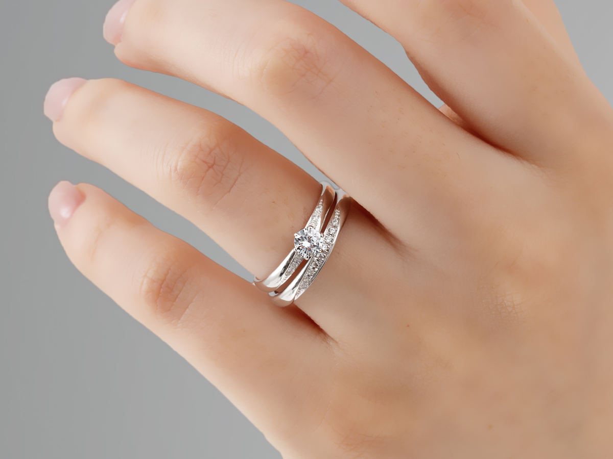 程よいボリューム感を感じるストレートラインの婚約指輪。斜めに美しく並ぶダイヤモンドの流れが目を惹くデザインです。