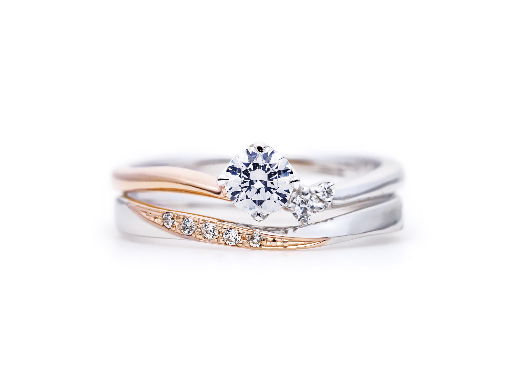 茂みから顔を出す 美しい月の姿……緩やかなSラインの婚約指輪は、アシンメトリーのメレダイヤモンドセッティングと左右にプラチナと18金ピンクゴールドをそれぞれ配して落ち着いた優美な雰囲気。