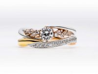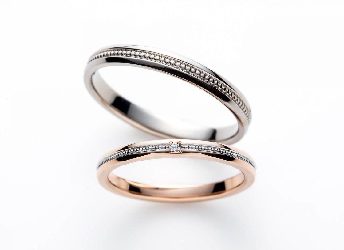 ミルグレインの小粒のデザインがクラシカルな印象の結婚指輪と、ピンクゴールドのリングにメレダイヤを並べた婚約指輪の組み合わせが肌なじみよく、大人の可愛さを演出してくれます。