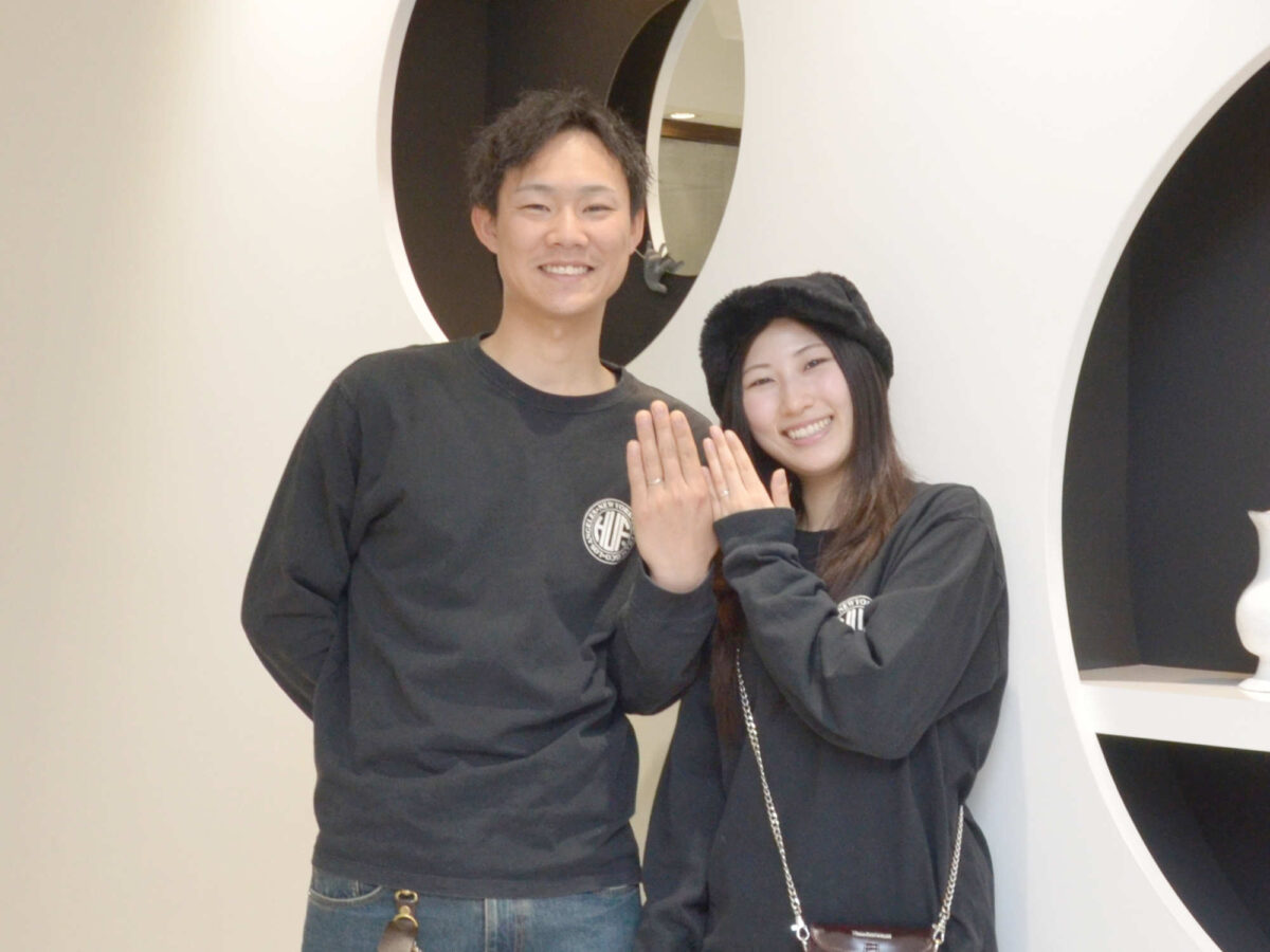 爽やかな明るい印象のおふたり。サプライズでダイヤモンド・プロポーズされて、その後環子さまのお気に入りデザインのご婚約指輪をお選びいただけ、ご結婚指輪はおふたり其々こだわりのものをご購入いただけました。感心するくらいおふたり共とてもよくお似合いでカッコイイです‼今後のクリーニングなどのメンテナンスもさせて頂きますので、いつでもお気軽にお申し付けください。またお会いできますのを楽しみにご来店お待ちしております。末永くお幸せに💛