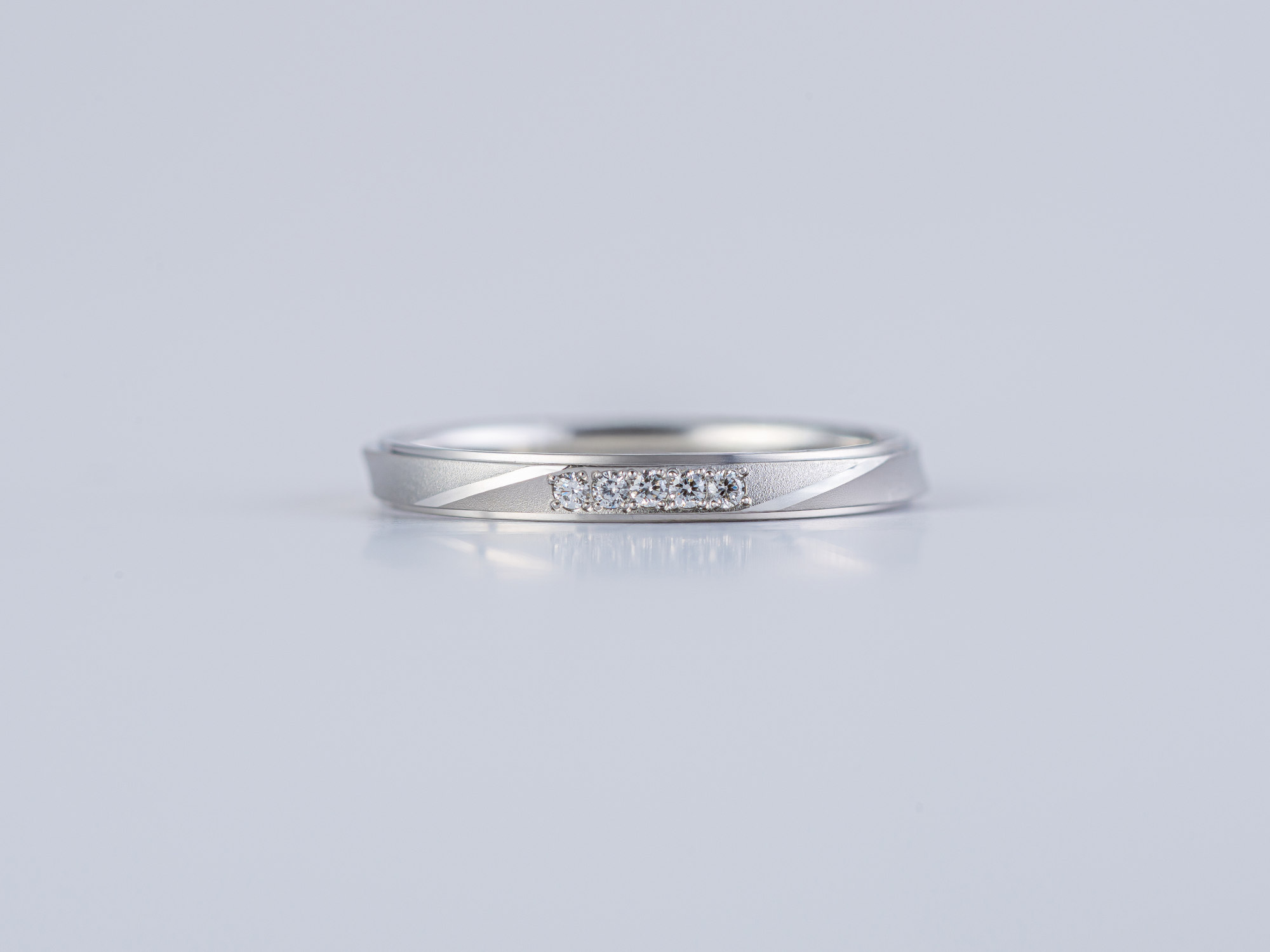 シャープなカットラインと繊細なつや消しのコントラストが、涼やかで洗練された印象を演出します。レディースは流れるラインにメレダイヤを配し、さりげない輝きを添えた結婚指輪です。