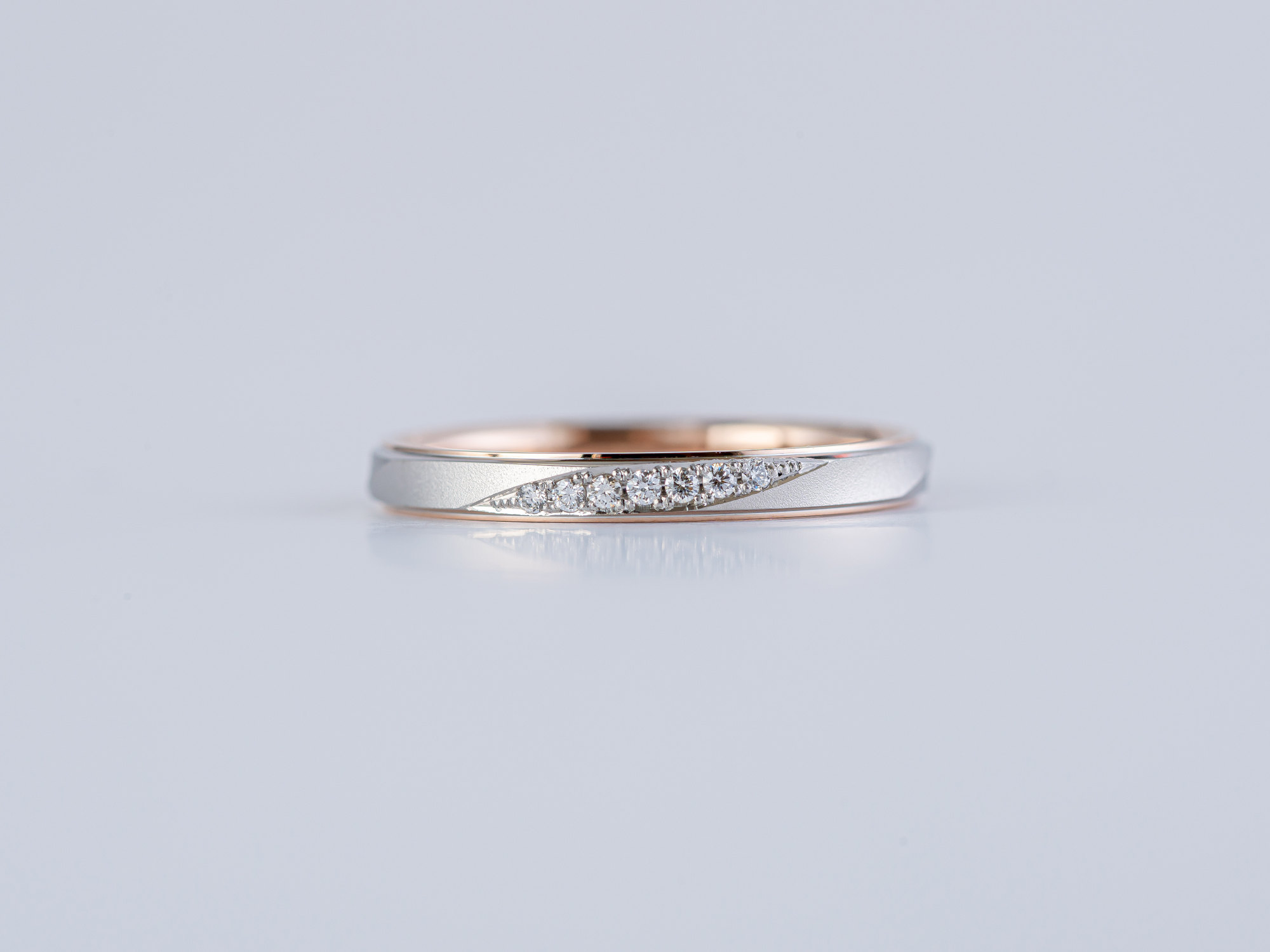 穏やかなつや消しの質感に、流れるラインに沿って連なるメレダイヤが実のようにきらめきます。ふたりの歩みが実を結ぶことを願った、あたたかな結婚指輪です。