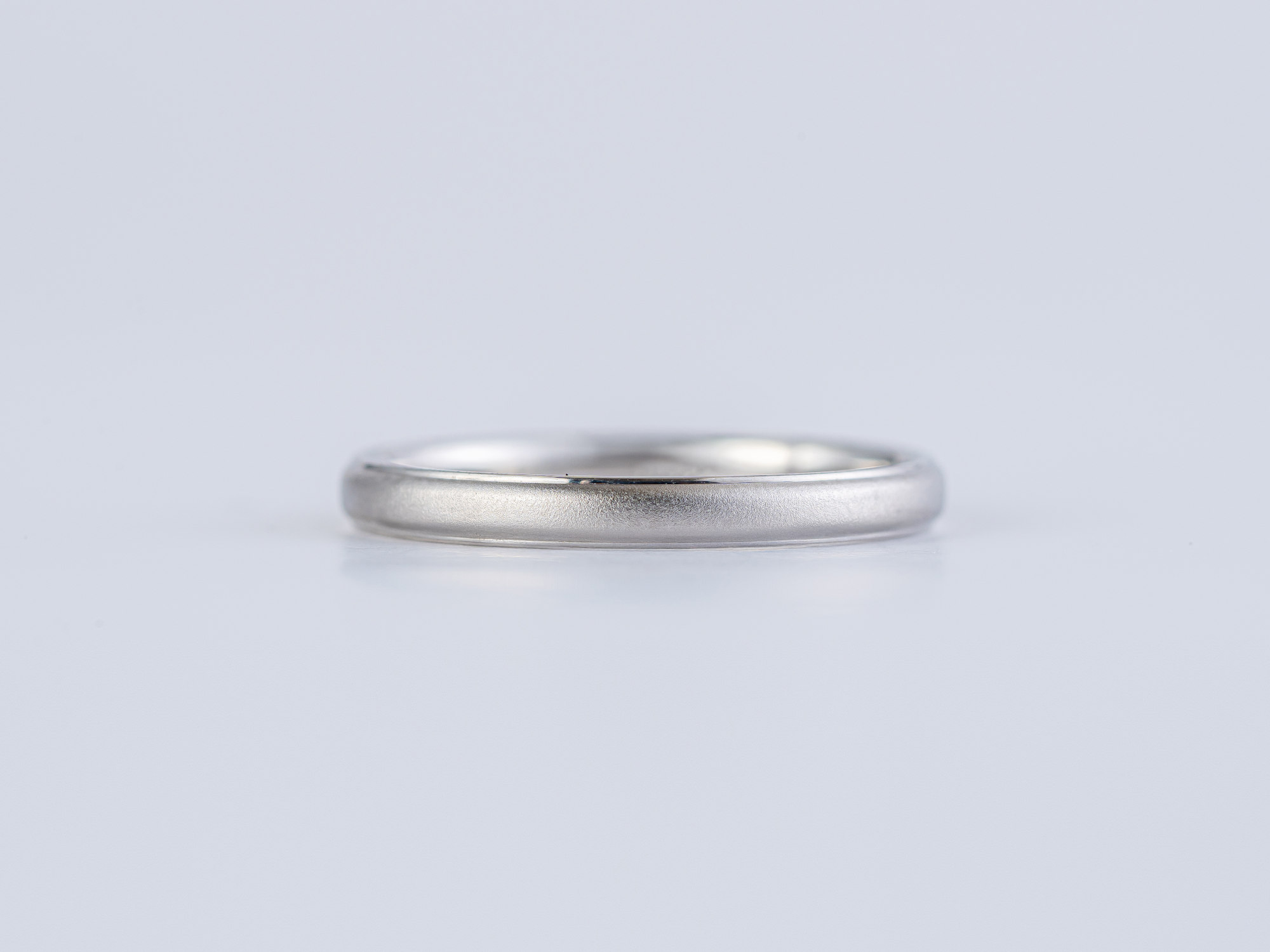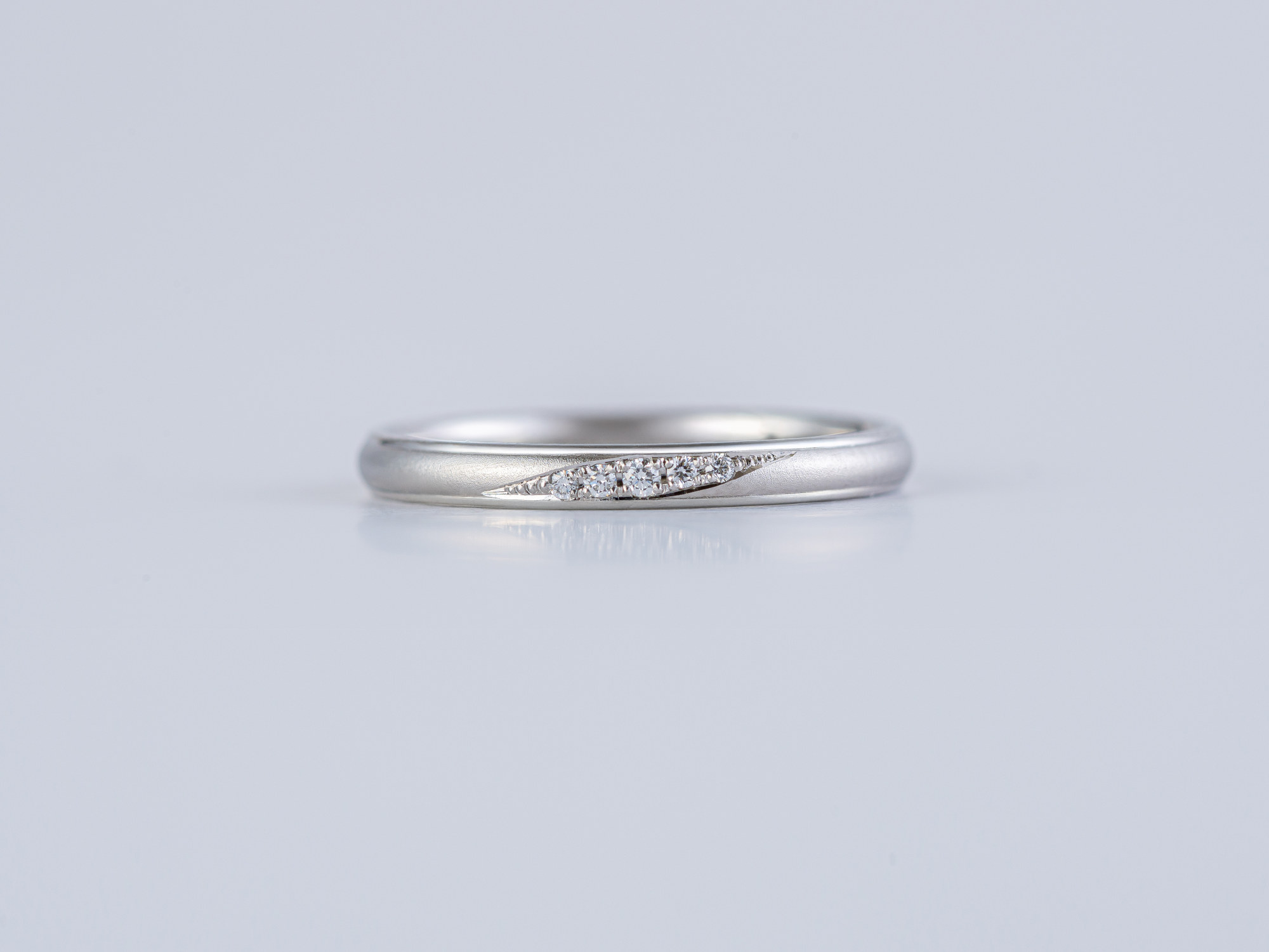 すっきりとしたストレートラインに、繊細なつや消しの質感が澄んだ冬の空気を映します。レディースは中央に流れるメレダイヤが雪のきらめきを思わせる、凛とした結婚指輪です。
