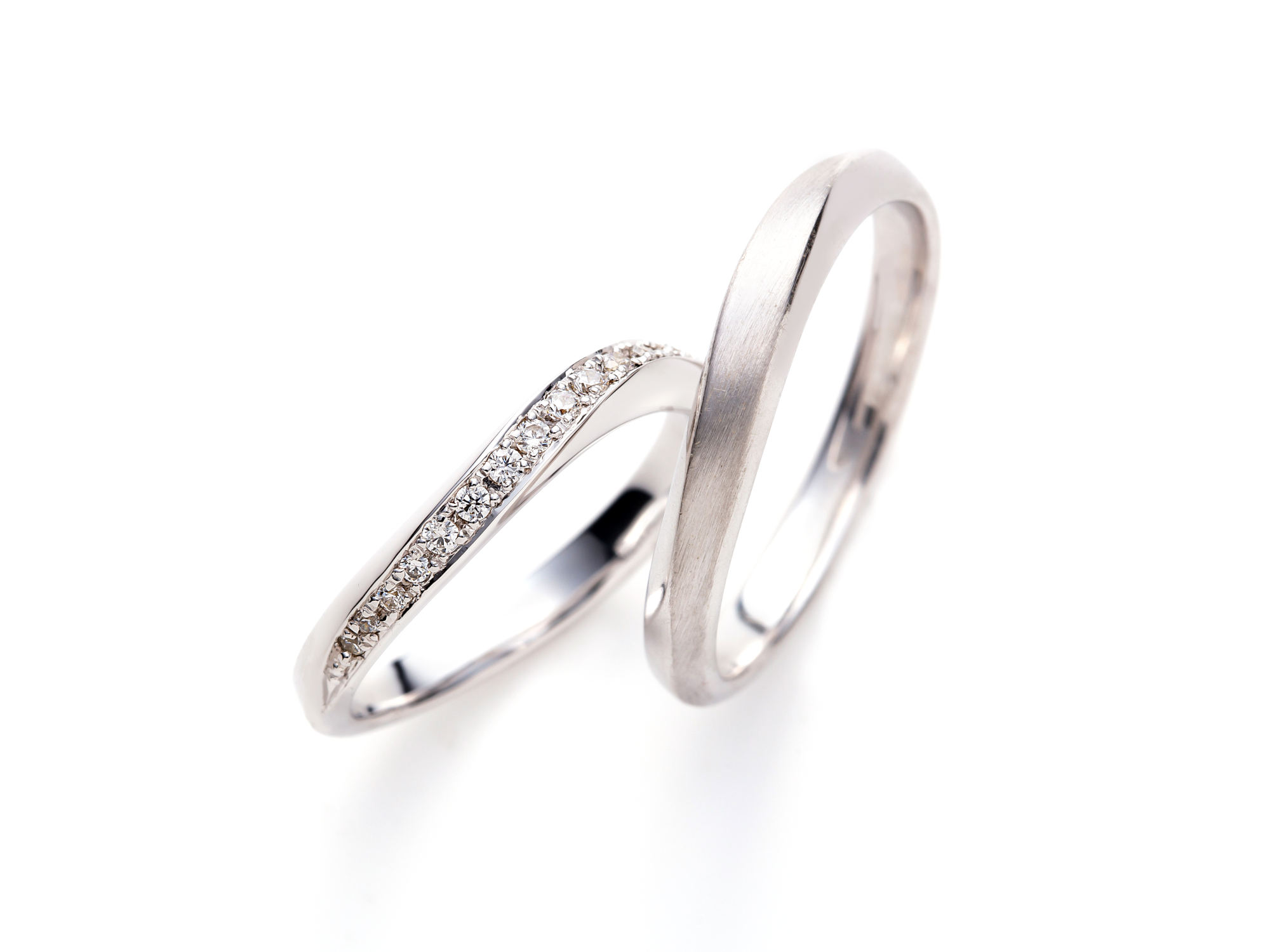 Ladies’は上品でしなやかなSラインに仕上げられたダイヤモンドの流れが美しく、Men’sは品のあるヘアラインマットのつや消し加工がアクセントに。一生を共にするリングは愛着を持てるデザインで選びたい、というおふたりにおすすめです。