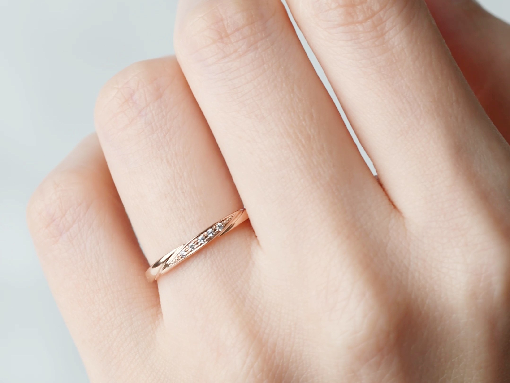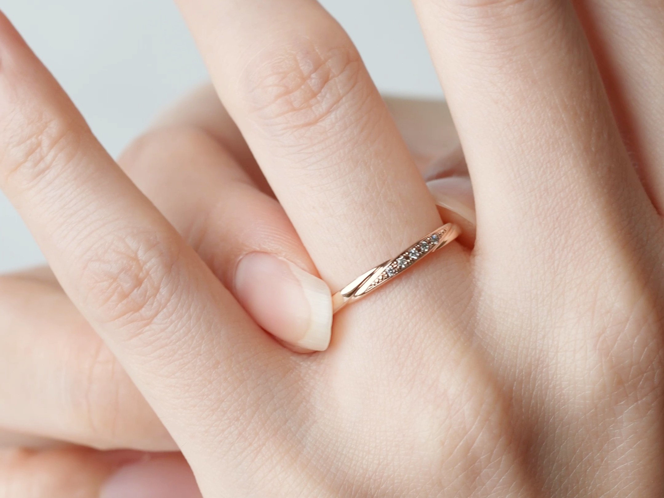斜めにカットされた石留め部分に配された5石のダイヤモンドは程よい華やかさで女性らしさを表現。ダイヤモンドのサイドにはミルの装飾を施して可愛らしさも併せ持つデザインに。優しくフィットする着け心地の良さも◎